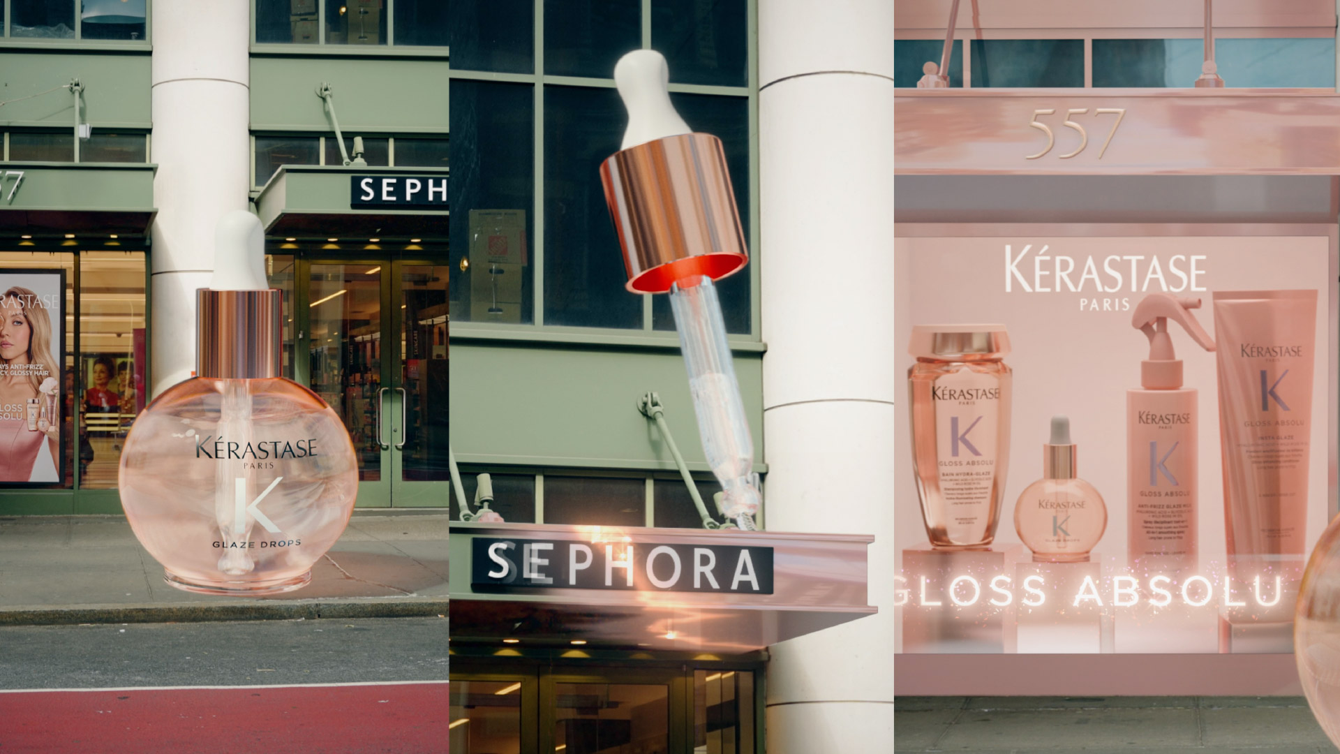 An external videographer visited iconic NYC streets and the Sephora flagship store in Broadway to capture footage to enable our Motion Design team to easily track every frame and seamlessly integrate a glossy transition and hyper-real 3D product. When imagining the concept, Kérastase pictured a dreamy yet realistic animated pipette glossing New York City’s Sephora, turning the entire store the same shade of delicate pink as the Gloss Absolu range.